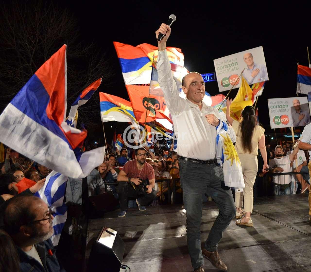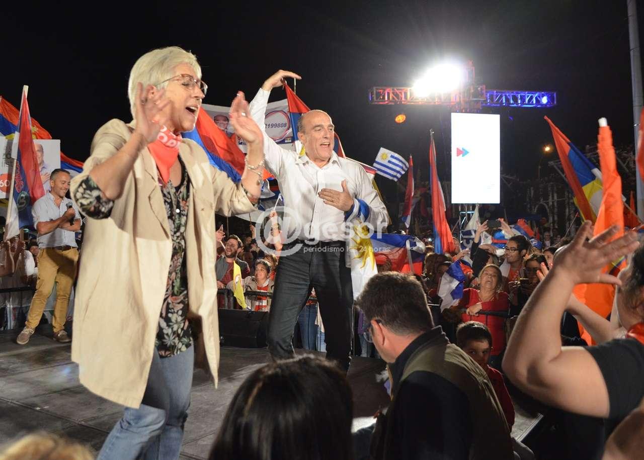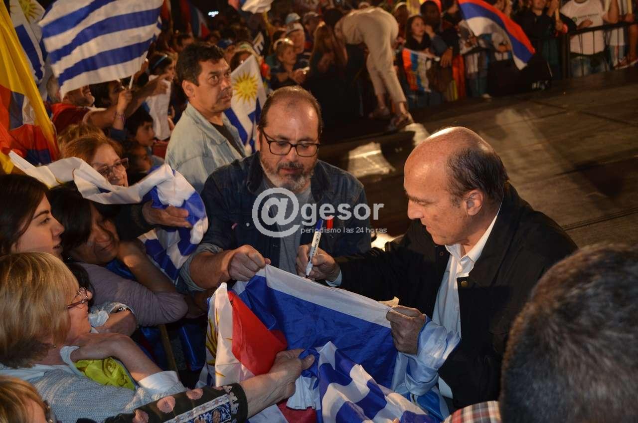 El candidato presidencial por el Frente Amplio  bromeó con los  militantes  durante  su discurso en el acto de cierre de campaña e Mercedes.  Daniel Martínez, mientras su compañera de fórmula  habla  a los  presentes, se  quedó  debajo del escenario firmando banderas o sacándose  fotos e  intercambiando  bromas con los asistentes. Al   tocarle el turno en la oratoria  ayudó a un  persona  para dejar  a  un lado un cartel que limitaba la visión  de quienes estaban atrás. “Hay que hacer de todo” dijo Martínez. “Multi oficio, vamo’arriba. Somos candidatos, ponemos carteles, vamo’arriba.  Hay que hacer todo, todo trabajo es digno. Lo sabemos quienes laburamos desde los 16 años. Que hemos construido nuestro futuro laburando con la gente. Y no quiero hacer comparaciones”.