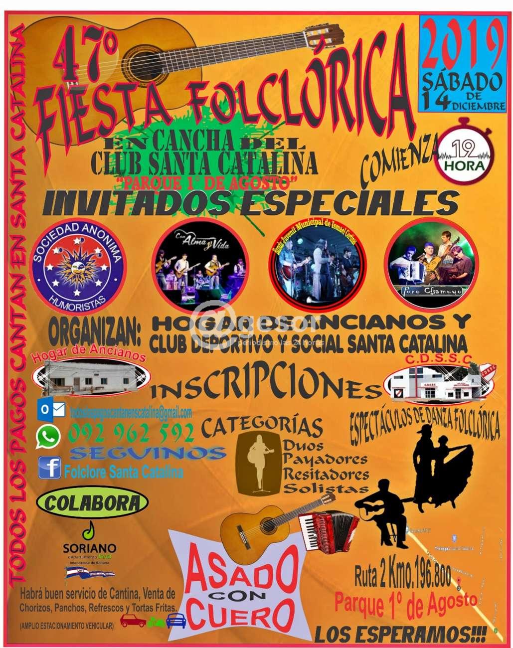 1) El Festival de Folclore "Todos los Pagos Cantan en Santa Catalina", es un Festival Certamen, organizado por las Comisiones de Santa Catalina, auspiciado por Ia Intendencia Municipal de Soriano, con el propósito de fomentar l0s expresiones más auténticas de nuestro SER nacional, a través de la música, promoviendo y auspiciando a los intérpretes y compositores de todo el país.
