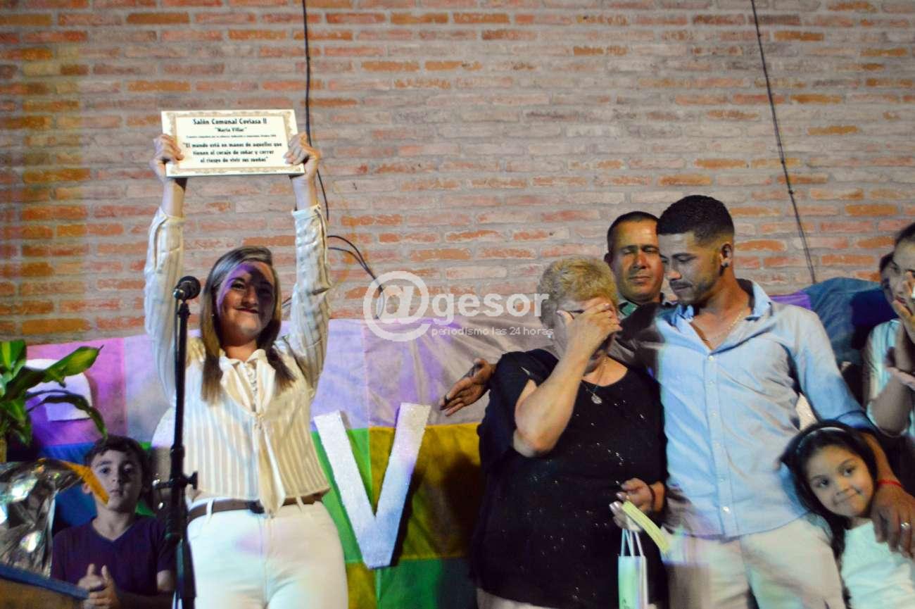 La Secretaria de COVIASA II en el momento de entregar la llave de la vivienda, pidió que no bajara del escenario a doña María Villar una de las integrantes de la familia que recibió la llave, porque tenían una sorpresa para esta señora y allí anunció que el salón comunal de COVISA II llevará el nombre de María Villar y exhibió en lo alto la plaqueta correspondiente que se colocará.
