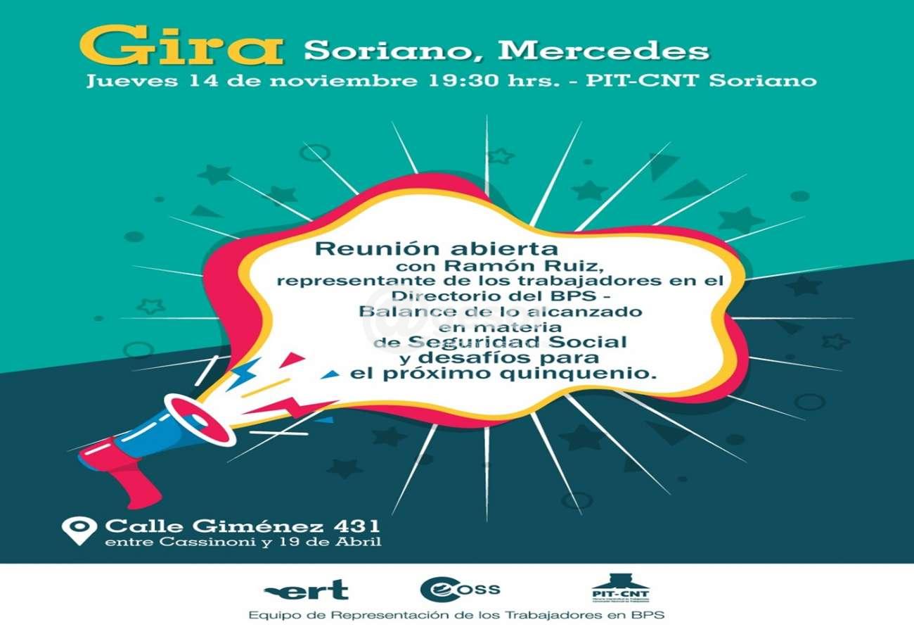 Este jueves a las 19,30 horas, en la sede del Plenario Intersindical de Soriano se realizará una reunión abierta donde se realizará un balance en materia de Seguridad Social y los desafíos para el próximo quinquenio. La misma estará a cargo de Ramón Ruiz, representante de los trabajadores en el directorio del BPS.