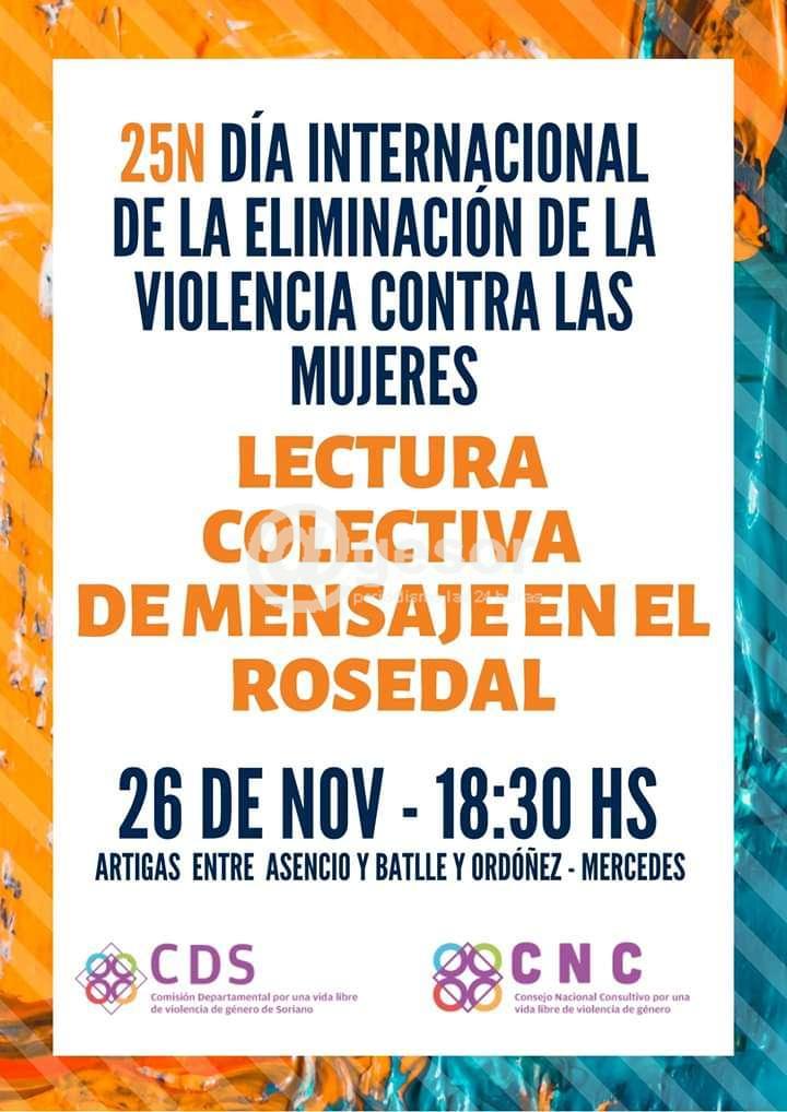 Si bien el Día Internacional de la eliminación de la violencia hacia las mujeres se conmemora el 25 de noviembre, este año debido a que es el día posterior al balotaje, se decidió correrlo para el martes 26, a las 18,30 horas. Como el año anterior la actividad se centrará junto al Rosedal, en la rambla de Mercedes, donde se encuentra el monumento a la madre. Allí se leerá en forma colectiva el mensaje de la Comisión departamental, integrada por ley por instituciones públicas estatales y sectores de la sociedad civil organizada.