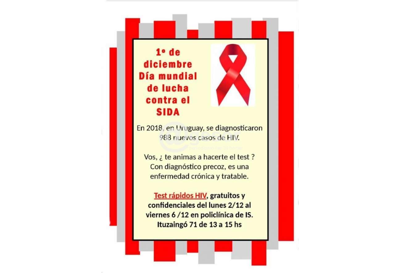 Desde este lunes 2 al viernes 6 habrá test rápidos de HIV, gratuitos y confidenciales, en policlínicas de la Intendencia de Soriano en Ituzaingó 71 de 13.00 a 15.00 horas.