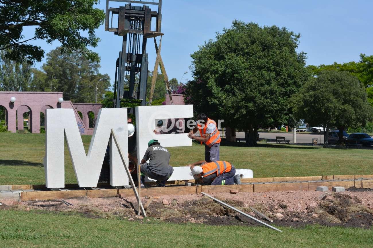 Las letras de hormigón, fueron confeccionadas en la Intendencia y son instaladas en su basamento por funcionarios municipales, siguiendo los lineamientos del Dpto. de Arquitectura de la Intendencia.