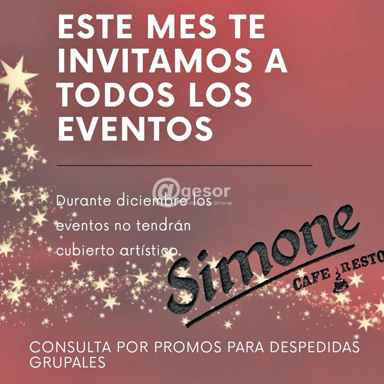 Este mes en SIMONE Café & Resto te invitamos a todos los eventos. Durante diciembre los eventos no tendrán cubierto artístico. En el local de avda. Lavalleja y Sánchez o a través del tel. 4533 8713 o el cel. 097 957 262 podés consultar y reservar fecha para despedidas grupales.