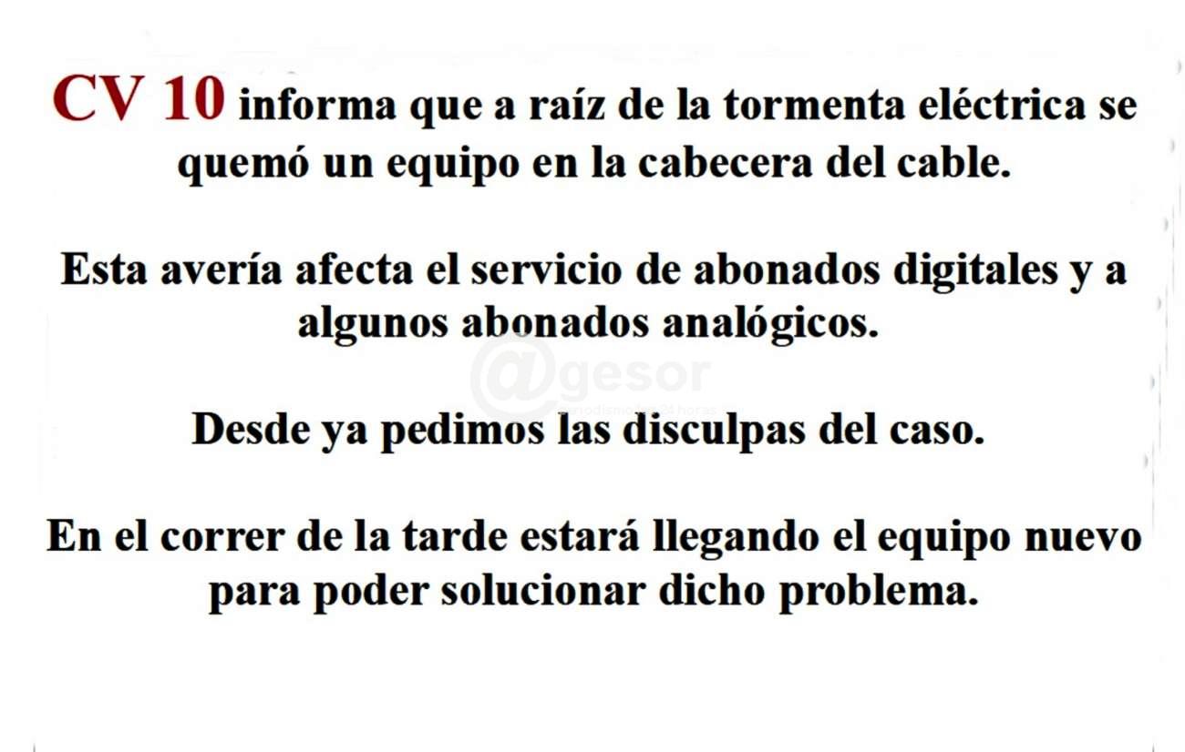CV 10 informa que a raíz de la tormenta eléctrica se quemó un equipo en la cabecera del cable.