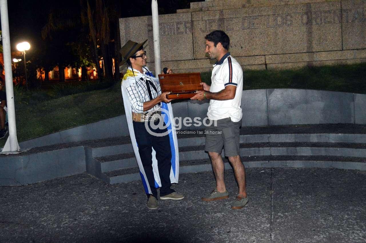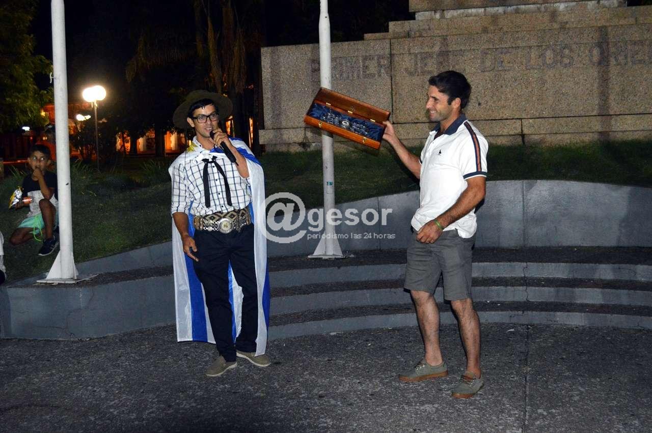 En plaza Artigas en la noche de este lunes luego de entonar las estrofas del himno nacional uruguayo," como muestra de tradición e identidad" según palabras del maestro profesor Oscar Gilardoni Gandolfo conductor de la instancia de homenaje.