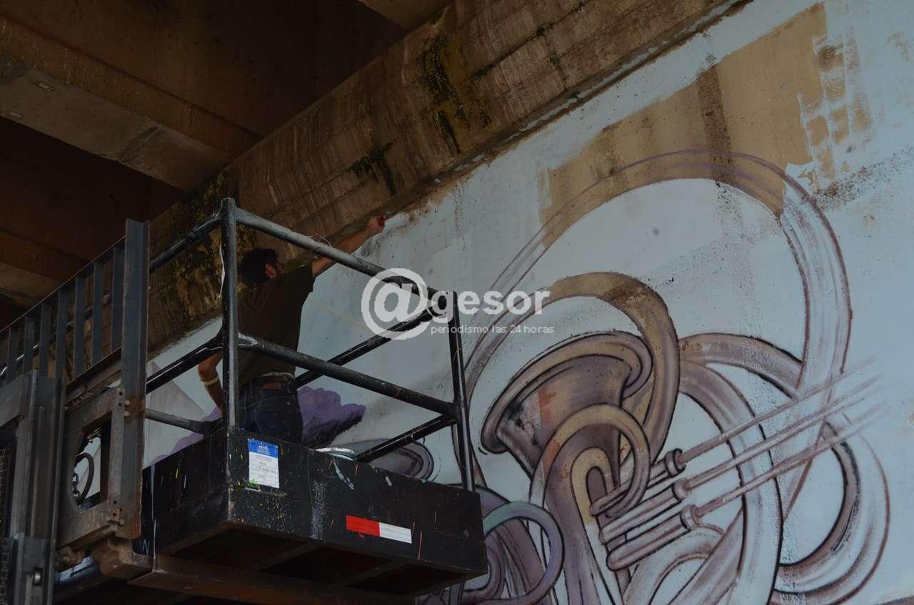 Debajo del puente “Líber Seregni” dos jóvenes Lina Castellanos (Colombia) y Naty Andreoli (Argentina) trepadas a un andamio la emprenden con pintura en uno de los altos pilares. Desde abajo se las ve más pequeñas de lo que realmente son. Al dialogar con ellas reconocieron “el espacio público” es duro “para las mujeres seas o no seas muralista” comentó Lina. “ Estamos expuestas al comentario de las personas, te quieren ayudar, ofrecer algo porque creen que no sos capaz”. Pero “nosotras llevamos años haciendo esto y no tenemos ningún problema ni con el esfuerzo físico, ni con manejar grúas. Pero te enfrentas a comentarios muchas veces machistas”.