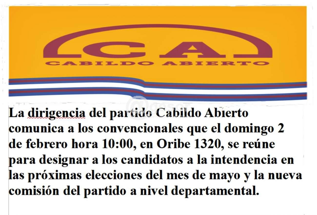 La dirigencia del partido Cabildo Abierto comunica a los convencionales que el próximo domingo 2 de febrero hora 10:00, en Oribe 1320, se reúne la misma para designar a los candidatos a la intendencia en las próximas elecciones del mes de mayo y la nueva comisión del partido a nivel departamental.