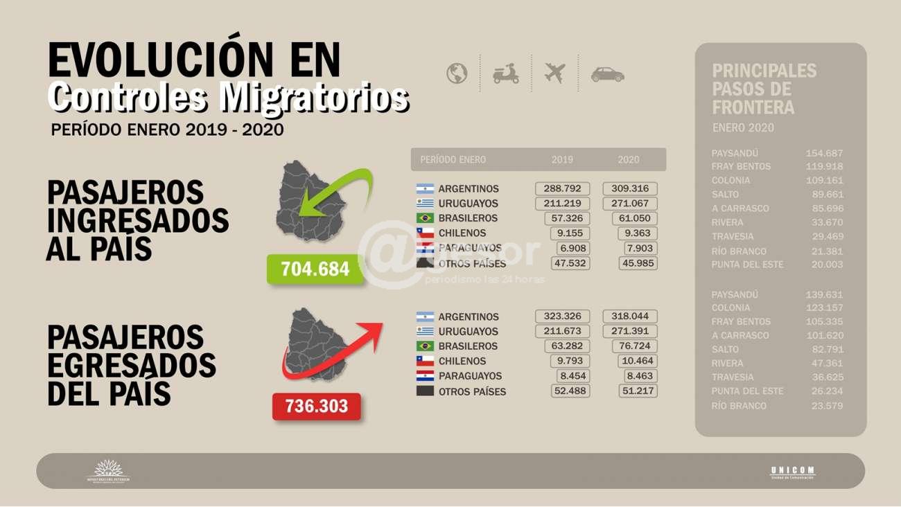 Los datos corresponden a enero de 2020, y refieren al ingreso de personas – no turistas - a nuestro país, donde se registró el ingreso de 704.684 personas a través de los cruces fronterizos con Brasil y Argentina.