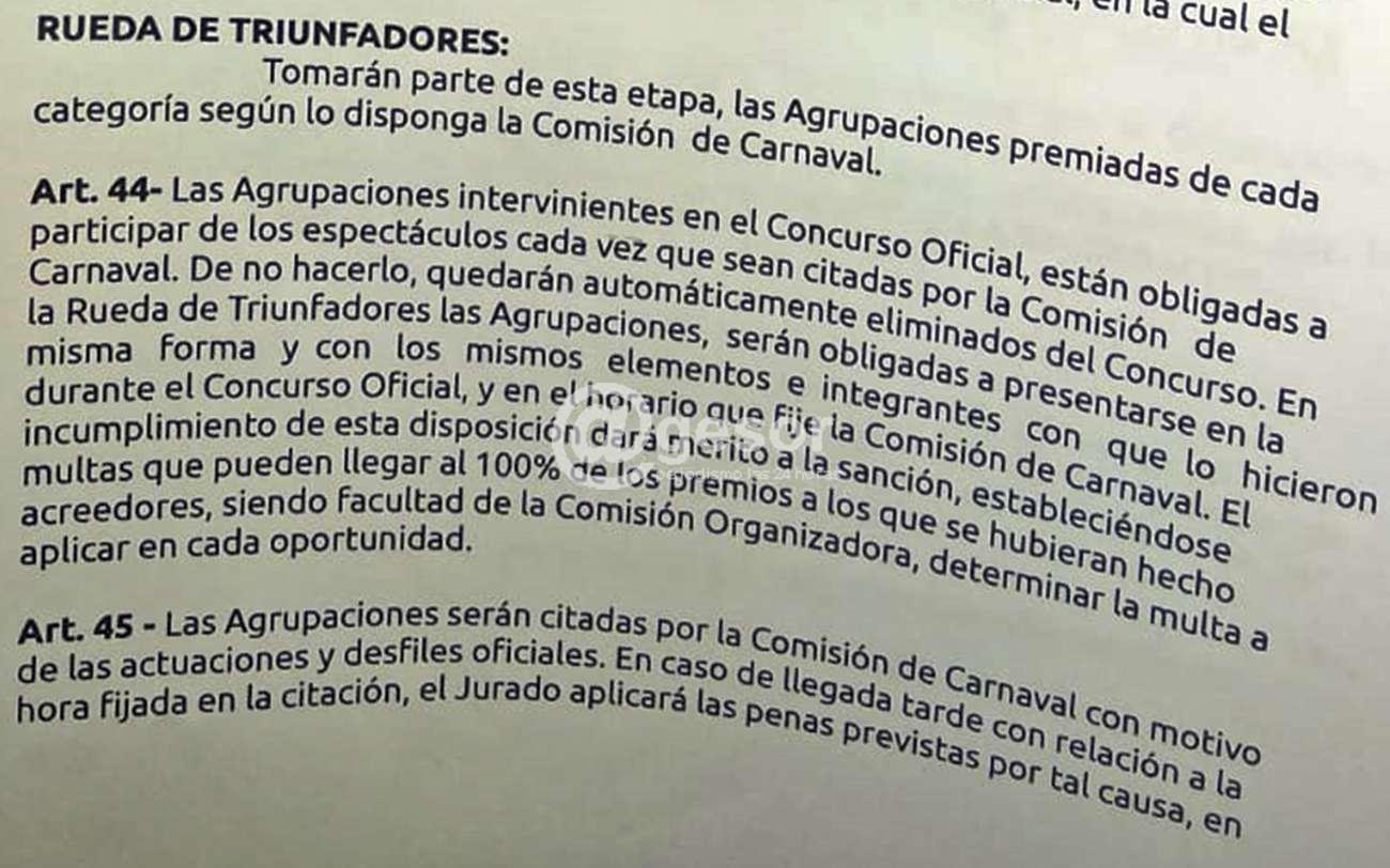 "Art. 44. Las agrupaciones intervinientes en el concurso oficial, están obligadas a participar de los espectáculos cada vez que sean citadas por la Comisión de Carnaval. De no hacerlo, quedarán automáticamente eliminados del concurso. En la Rueda de Triunfadores las agrupaciones, serán obligadas a presentarse en la misma forma y con los mismos elementos e integrantes con que lo hicieron durante el concurso oficial, y en el horario que fije la Comisión de Carnaval. El incumplimiento de esta disposición dará mérito a la sanción, estableciéndose multas que pueden llegar al 100% de los premios a los que se hubieran hecho acreedores, siendo facultad de la Comisión Organizadora, determinar la multa a aplicar en cada oportunidad".
