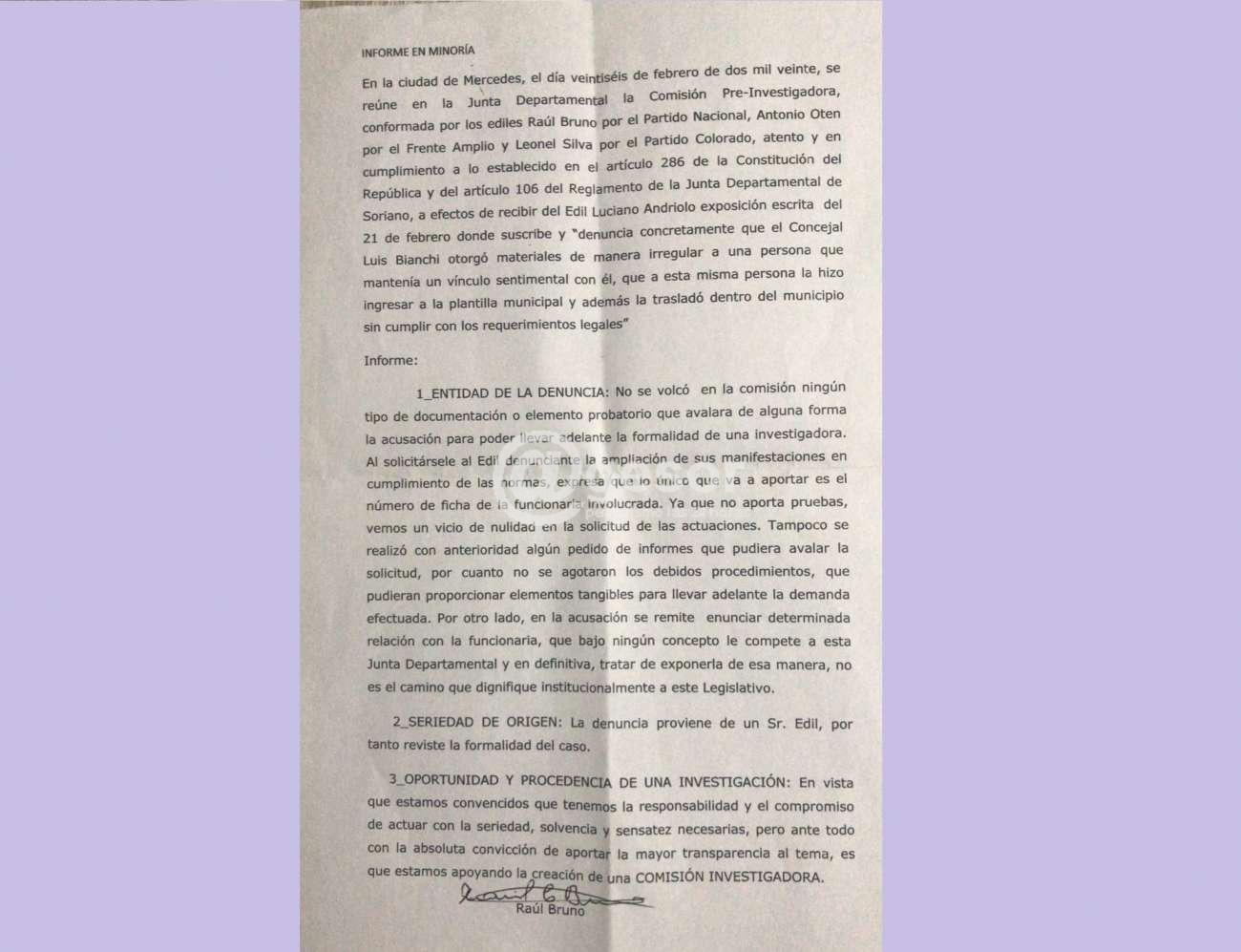 “2En la ciudad de Mercedes, el día veintiséis de febrero de dos mil veinte, se reúne en la Junta Departamental la Comisión Pre-Investigadora, conformada por los ediles Raúl Bruno por el Partido Nacional, Antonio Oten por el Frente Amplio y Leonel Silva por el Partido Colorado, atento y en cumplimiento a lo establecido en el artículo 286 de la Constitución del República y del artículo 106 del Reglamento de la Junta Departamental de Soriano, a efectos de recibir del Edil Luciano Andriolo exposición escrita del 21 de febrero donde suscribe y “denuncia concretamente que el Concejal Luis Bianchi otorgó materiales de manera irregular a una persona que mantenía un vínculo sentimental con él, que a esta misma persona la hizo ingresar a la plantilla municipal y además la trasladó dentro del municipio sin cumplir con los requerimientos legales”
