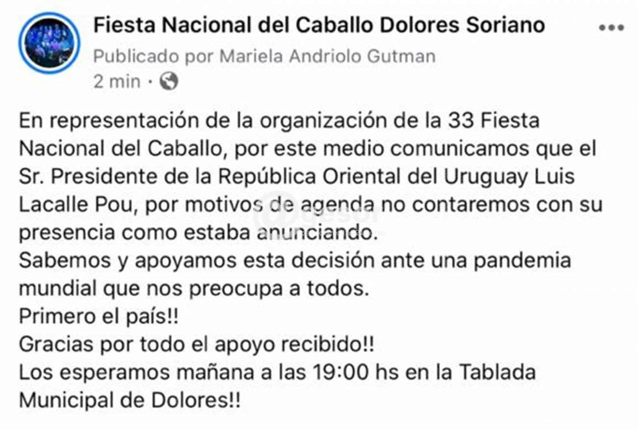 La comunicación oficial de la Fiesta Nacional del Caballo de Dolores emitió comunicado en el que expresa: "En representación de la organización de la 33a. Fiesta Nacional del Caballo, por este medio comunicamos que el Sr. Presidente de la República Oriental del Uruguay Luis Lacalle Pou, por motivos de agenda no contaremos con su presencia como estaba anunciado.