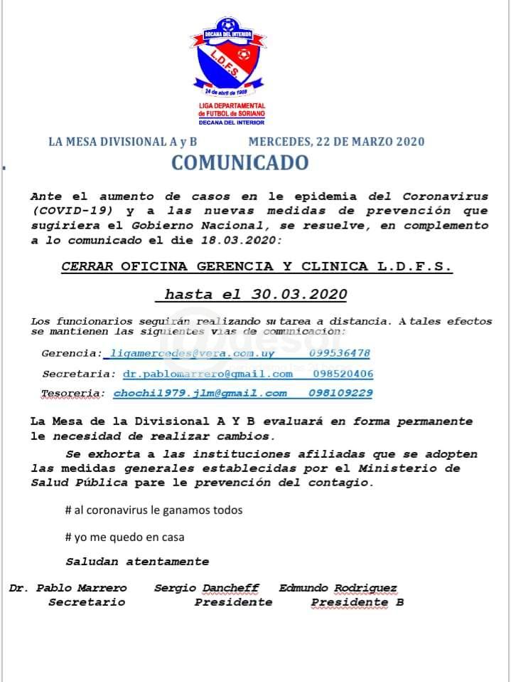 La Mesa Divisional A y B comunican que ante el aumento de casos en la epidemia del coronavirus (COVID 19), y a las nuevas medidas de prevención que sugiriera el Gobierno Nacional, se resuelve, en el cumplimiento de la comunicado el día 1803 2020 cerrar oficina gerencia y clínica de la Liga Departamental de Fútbol de Soriano hasta el 30 - 03- 2020.