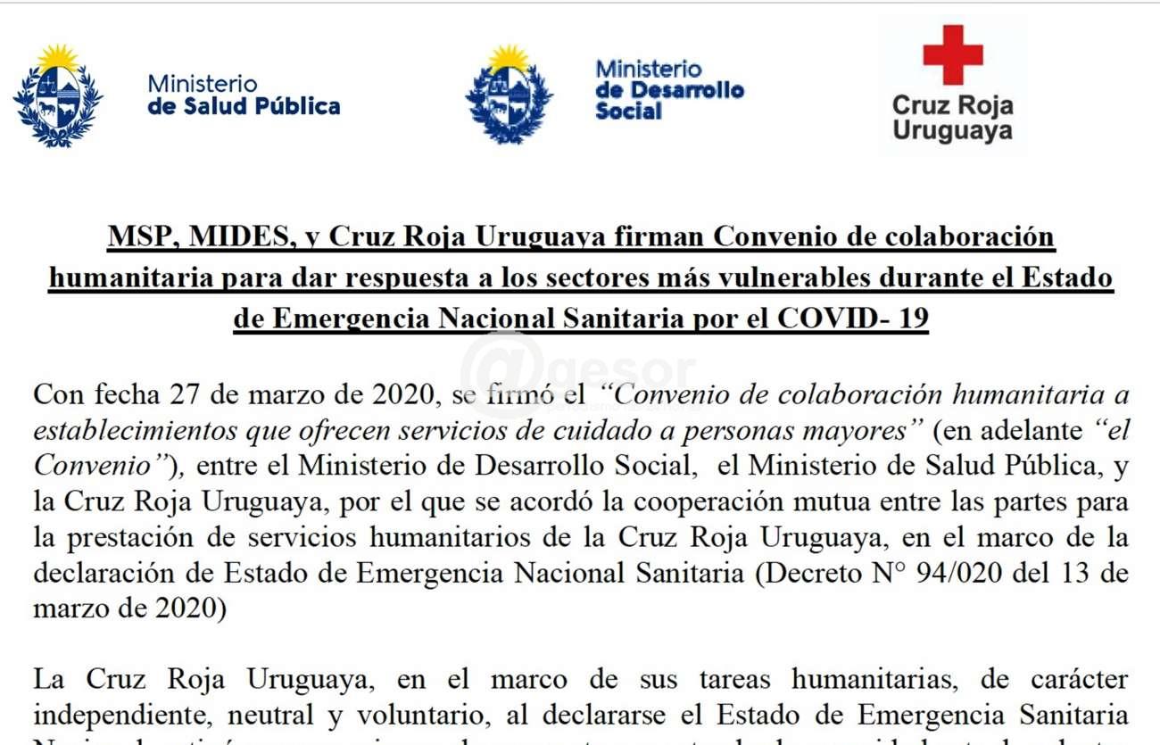 Con fecha 27 de marzo se firmó el “Convenio de colaboración humanitaria a establecimientos que ofrecen servicios de cuidado a personas mayores”, entre el Ministerio de Desarrollo Social, el Ministerio de Salud Pública, y la Cruz Roja Uruguaya, por el que se acordó la cooperación mutua entre las partes para la prestación de servicios humanitarios de la Cruz Roja Uruguaya, en el marco de la declaración de Estado de Emergencia Nacional Sanitaria (Decreto N° 94/020 del 13 de marzo de 2020).
