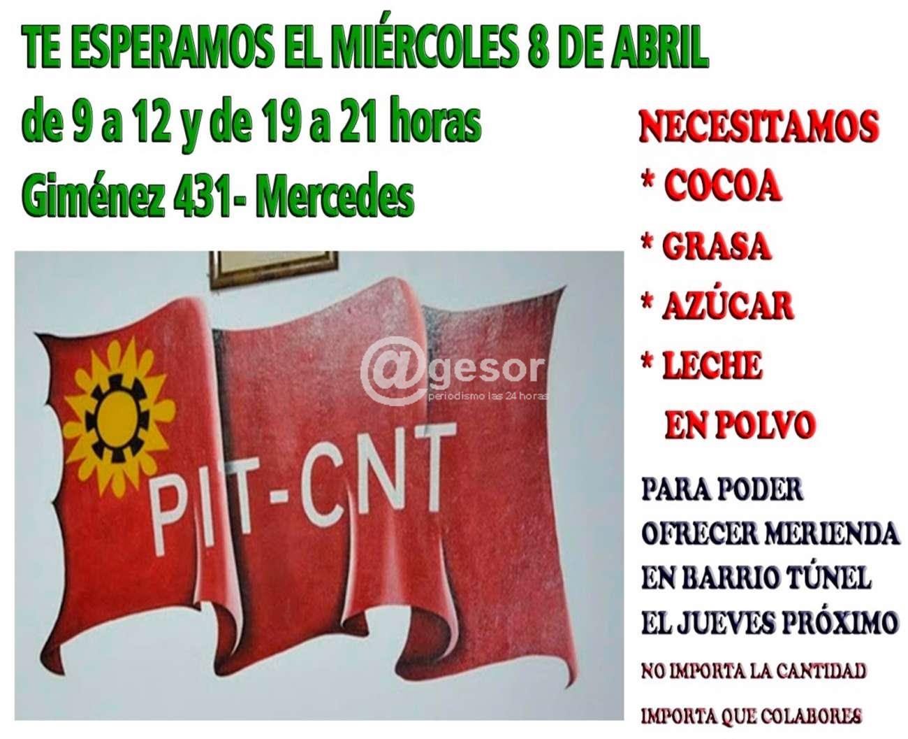 Este miércoles el Plenario Intersindica de Soriano recibe donaciones para poder ofrecer una merienda en el barrio Túnel de Mercedes. Se necesita cocoa, grasa, azúcar, leche en polvo. “No importa la cantidad, importa que colabores”, expresa el PIT CNT local en un comunicado.