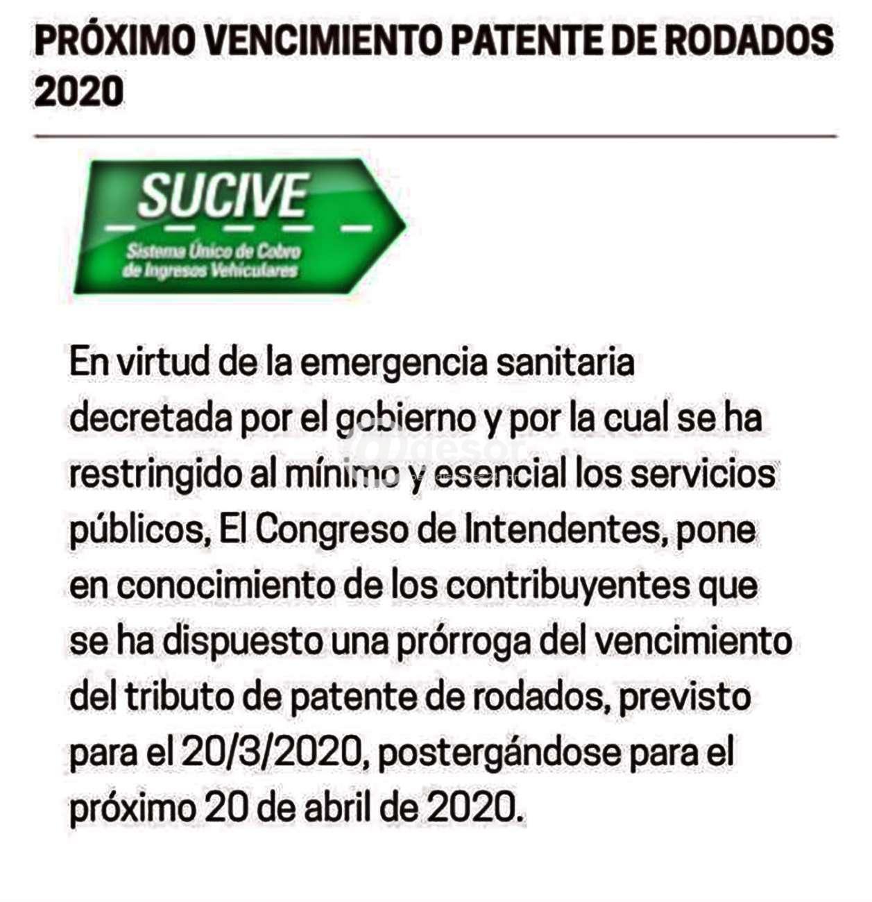 En virtud de la emergencia sanitaria decretada por el gobierno y por la cual se ha restringido al mínimo y esencial los servicios públicos, el Congreso de Intendentes, pone en conocimiento de los contribuyentes que se ha dispuesto una prórroga del vencimiento del tributo de patente de rodados, previsto para el 20/3/2020, postergándose para el este lunes 20 de abril de 2020, lo que hasta el momento se mantiene tal cual.