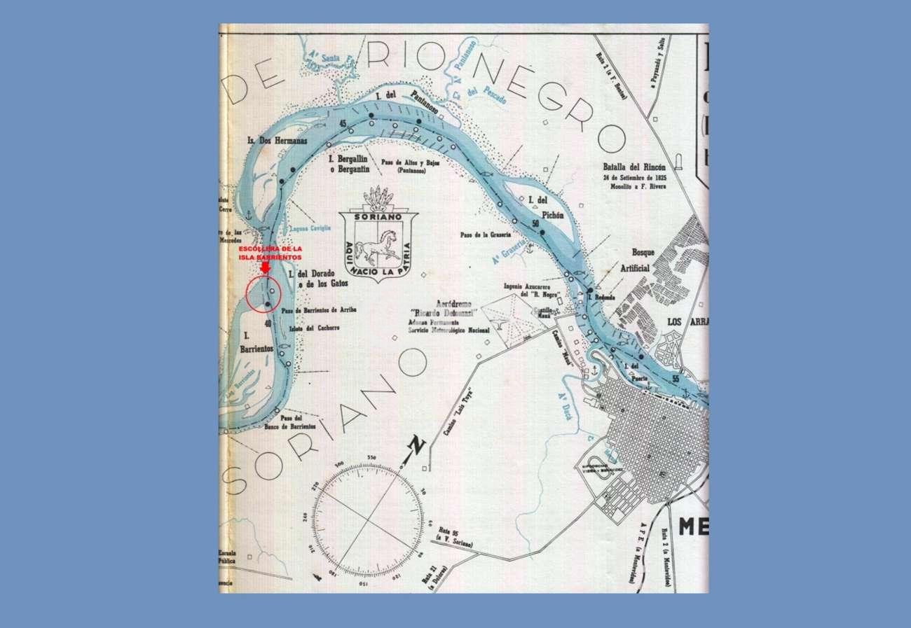 Ahora bien, río abajo de Mercedes, eran y son varios los pasos que dificultan la navegación, tales como el del ingreso al Muelle Comercio de Mercedes, el paso de la isla del Pantanoso [Altos y Bajos, Km. 45], el de isla Barrientos [Km. 40 del río Negro] o el del “Banco Grande” [Km. 25], eligiéndose el paso de Barrientos para el ensayo de un sistema que consistía «en la construcción de espigas permeables, perpendiculares a la costa, que tiene por objeto, estrechar el cauce del río para aumentar localmente la fuerza de la corriente a fin de que arrastren las materias sueltas que obstruyen el canal y por ese medio conseguir modificar el régimen del río en sentido favorable para el aumento progresivo de las profundidades de los sitios donde existen altos fondos».1