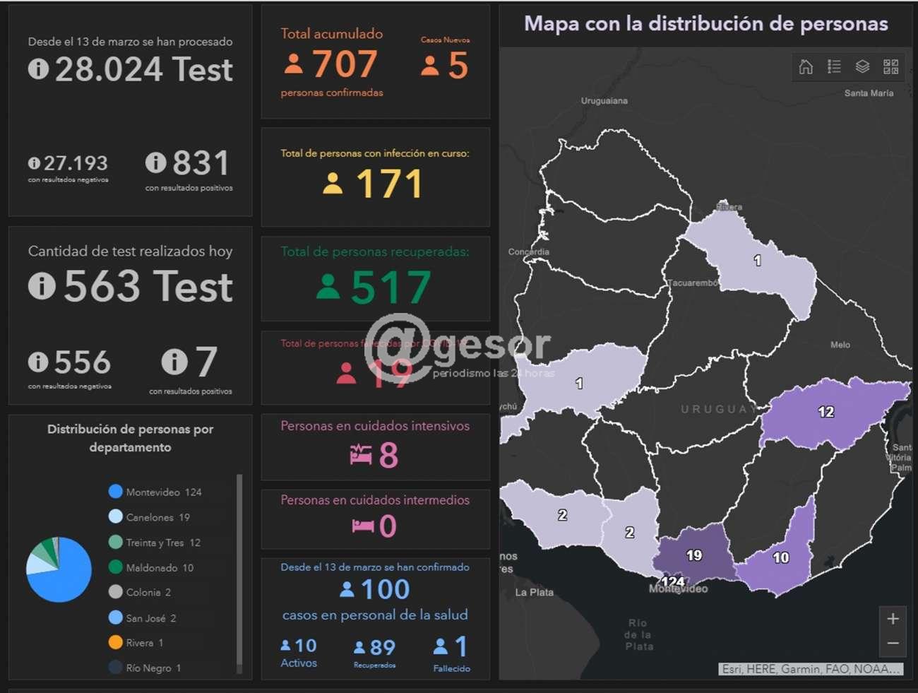 Los departamentos con casos confirmados al día de hoy son 8: Canelones, Colonia, Maldonado, Montevideo, Río Negro, Rivera, San José y Treinta y Tres.