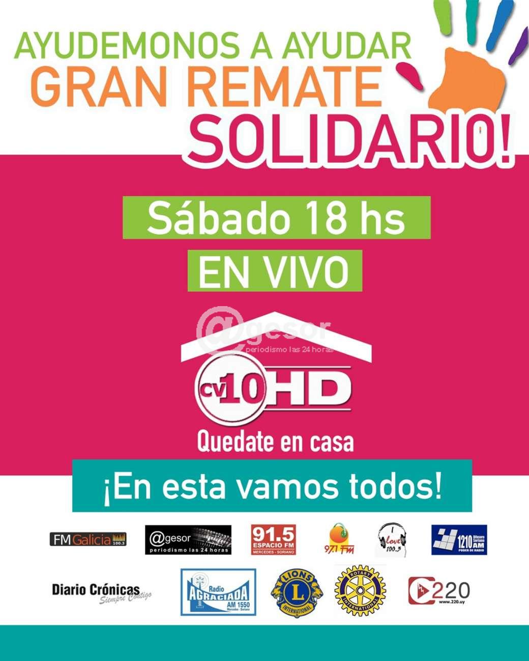 Este sábado 30 a las 18.00 horas estará desarrollándose gran remate solidario, el que se transmitirá a través de CV10 en cable de Mercedes, con la finalidad de recabar fondos para familias vulnerables que se han venido inscribiendo a través de celular 099 303 876, las que han sido asistidas con las canastas y ropa de abrigo, superando las 300 familias. Con lo recaudado en este remate solidario estará ayudándose a otras familias que están también en situación vulnerable. Cabe señalar que el remate estará ofreciendo diversos elementos y materiales que fueron donados por la población durante la campaña solidaria efectuada en distintos barrios e instituciones deportivas de Mercedes, con el apoyo de distintos medios de comunicación y la invalorable ayuda de las instituciones de servicio.