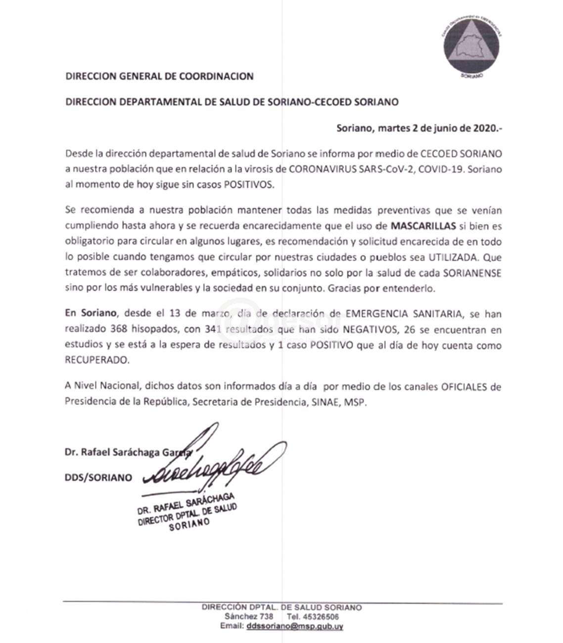 Soriano tiene 26 casos a estudio y ningún positivo de Covid-19. Así lo informó este martes 2 de junio la Dirección Departamental de Salud en su reporte diario. En él se detalla que desde el 13 de marzo a la fecha se han realizado en el departamento 368 hisopados, de los cales 341 dieron como resultado negativo y 26 se encuentran actualmente a la espera del resultado.