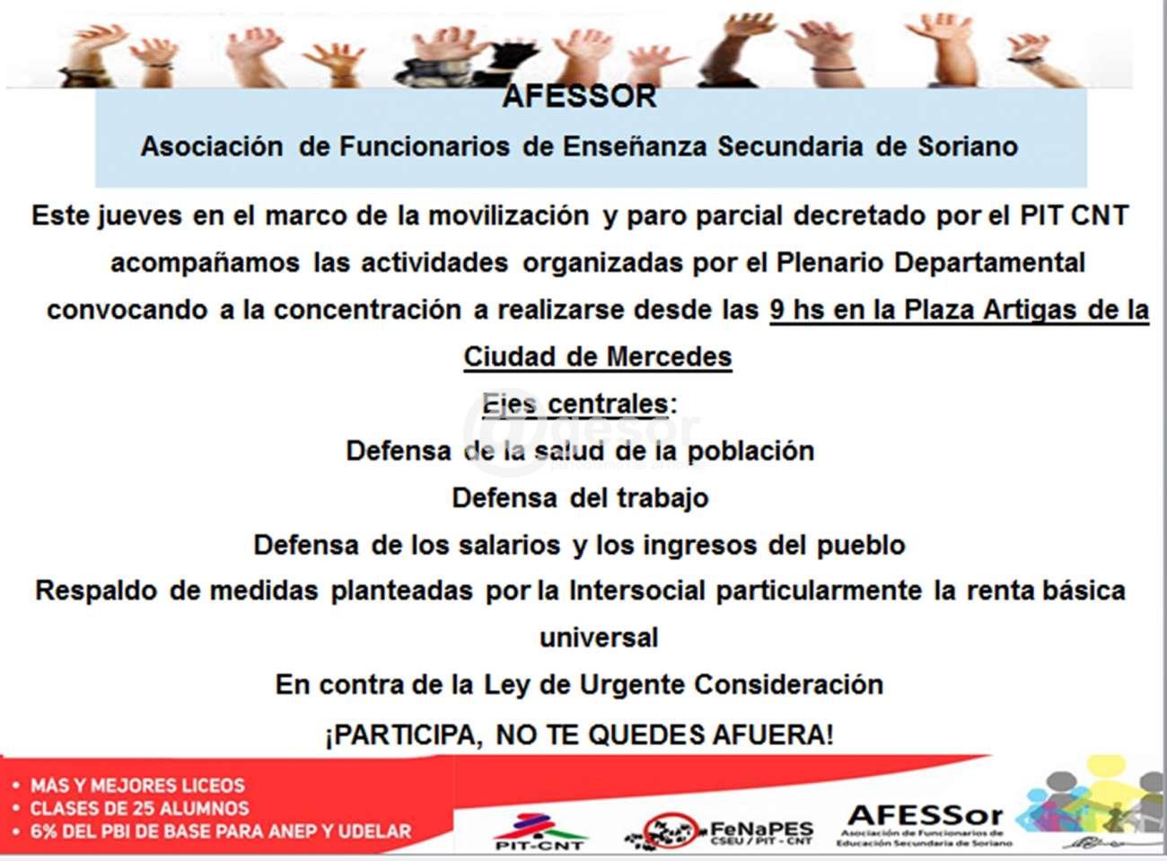 Este jueves en el marco de la movilización y paro parcial decretado por el PIT CNT acompañamos las actividades organizadas por el Plenario Departamental convocando a la concentración a realizarse desde las 9 hs en la Plaza Artigas de la Ciudad de Mercedes
