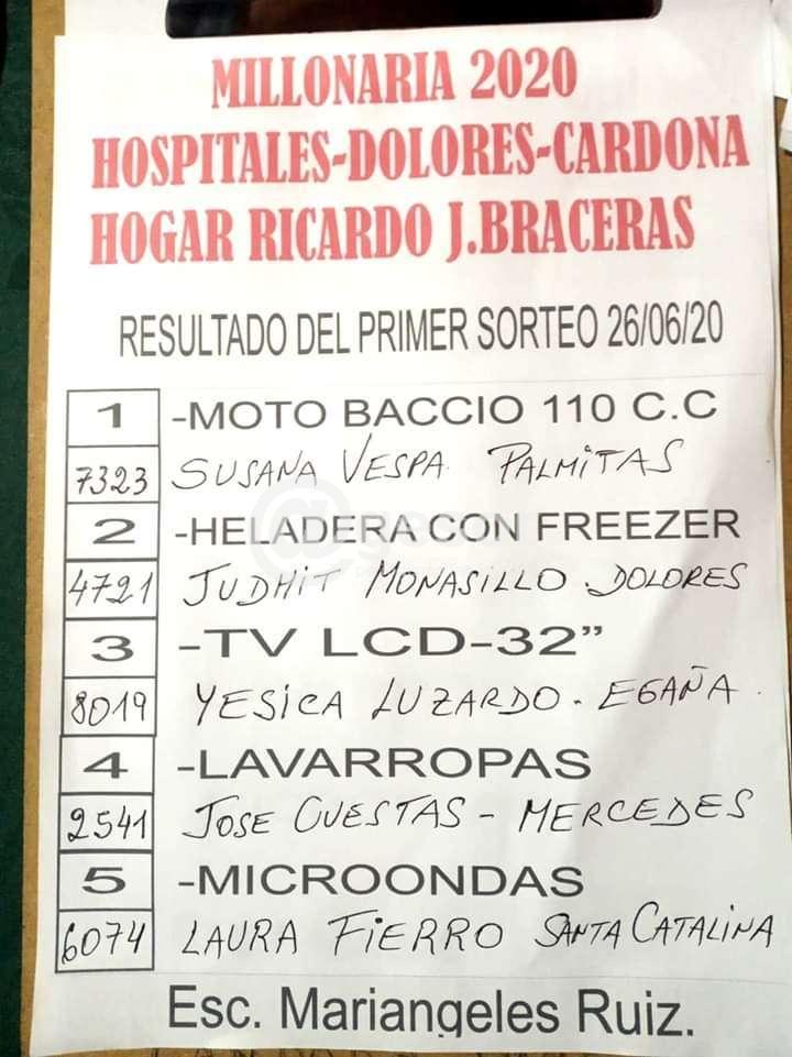 El 1er. premio, con una moto Baccio 110 CC. salió favorecida Susana Vespa de Palmitas (Nº7323), con el 2do. premio, con una heladera la favorecida fue Judhit Monasillo de Dolores (Nº4721), mientras el 3er. premio, con un TV 32, la ganadora fue Yesica Luzardo de Egaña (Nº8019), el 4to. premio con un lavarropas, favoreció a José Cuestas de Mercedes (Nº2541), y el 5to. y último premio se fue para Santa Catalina, siendo acreedora Laura Fierro (Nº6074).