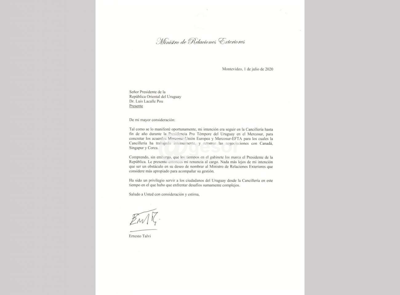 “Ha sido un privilegio servir a los ciudadanos de mi país desde la Cancillería en este tiempo en el que hubo que enfrentar desafíos sumamente complejos”, expresó en su cuenta de twitter el Canciller Ernesto Talvi, efectivizando lo que había anunciado semanas atrás.