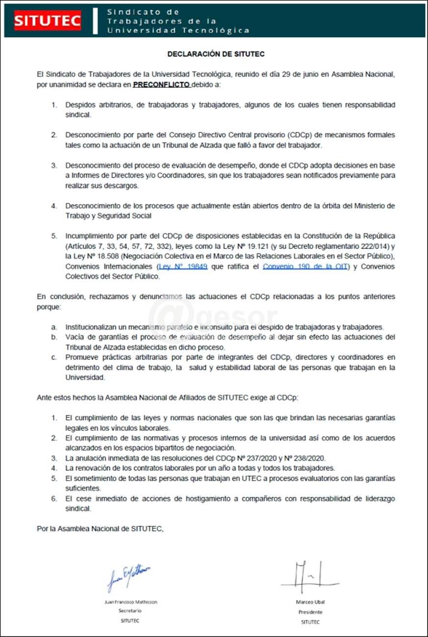 El Sindicato de Trabajadores de la Universidad Tecnológica (SITUTEC) se declaró en pre conflicto ante “despidos arbitrarios” y otras medidas dispuestas por el Consejo Directivo Central provisorio. Pidiendo el cumplimiento de las normativas, la renovación de contratos laborales y “el cese inmediato de acciones de hostigamiento a compañeros con responsabilidad de liderazgo sindical”. Entre otras medidas.