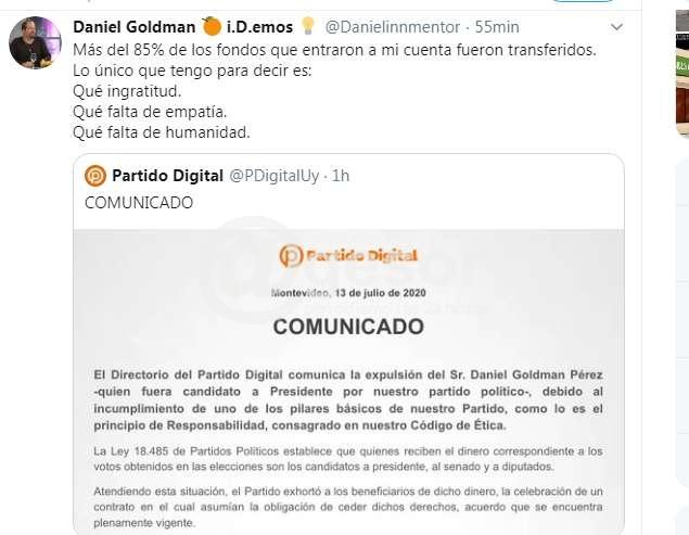 El Partido Digital que en las pasadas elecciones debutó electoralmente decidió expulsar a quien fuera su candidato a Presidente por contravenir los principios partidarios. En un comunicado difundido en su cuenta de twitter, el Partido Digital informó que decidió "la expulsión del Sr. Daniel Goldman Pérez -quien fuera candidato a Presidente por nuestro partido político-, debido al incumplimiento de uno de los pilares básicos de nuestro Partido, como lo es el principio de Responsabilidad, consagrado en nuestro Códiigo de Ética".