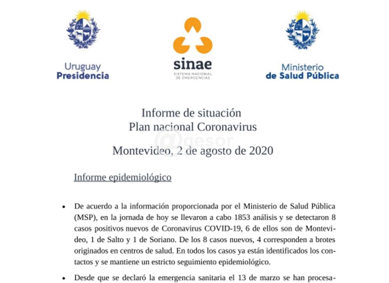 De acuerdo a la información proporcionada por el Ministerio de Salud Pública (MSP), en la jornada de hoy se llevaron a cabo 1853 análisis y se detectaron 8 casos positivos nuevos de Coronavirus COVID-19, 6 de ellos son de Montevideo, 1 de Salto y 1 de Soriano. De los 8 casos nuevos, 4 corresponden a brotes originados en centros de salud. En todos los casos ya están identificados los contactos y se mantiene un estricto seguimiento epidemiológico.