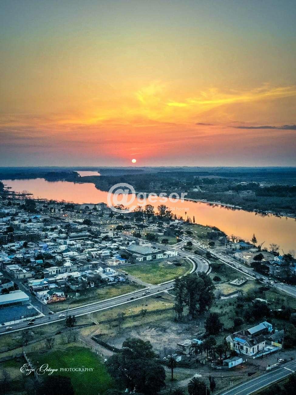 Las fotografías del atardecer en la ciudad de Mercedes, registradas por Enzo Ortega Photography, nos muestras en estas postales una parte de la capital sorianense, vista desde el aire y teniendo como parte especial la costa y el fluir de las aguas del río Negro. Pero también puede apreciarse desde arriba la estructura del histórico Castillo del Barón de Mauá ubicado en el parque de igual nombre, un paseo tradicional en el ejido de la ciudad muy visitado por los mercedarios y los visitantes. También puede verse la estructura edilicia de lo que fuera la gran fábrica que tuviera Mercedes, con el exingenio azucarero de ARINSA en la década de los años 70 y que hoy se mantiene prácticamente sin actividad, salvo algo mínimo.