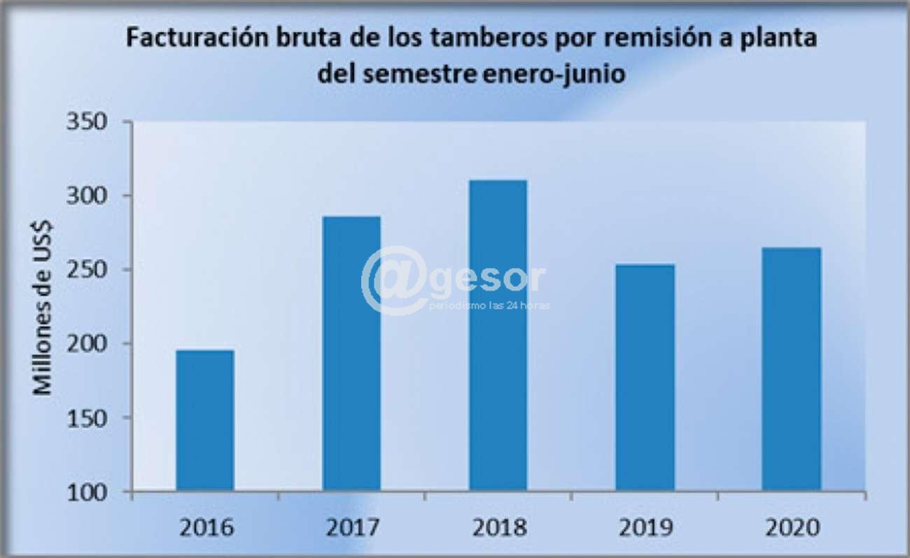 La facturación bruta en dólares de los tamberos por la remisión de leche a plantas industriales totalizó US$ 265 millones en el semestre enero-junio, una mejora de US$ 11 millones respecto a los US$ 254 millones de igual período de 2019. Sin embargo, ese dato estuvo por debajo de los US$ 311 millones de 2018 y los US$ 286 millones de 2017. Estos ingresos brutos no tienen en cuenta la evolución de los costos de las explotaciones lecheras. Además, estas cifras incluyen los grandes volúmenes de leche que procesan los dos megatambos: Estancias del Lago (Bulgheroni) y la multinacional Olam.