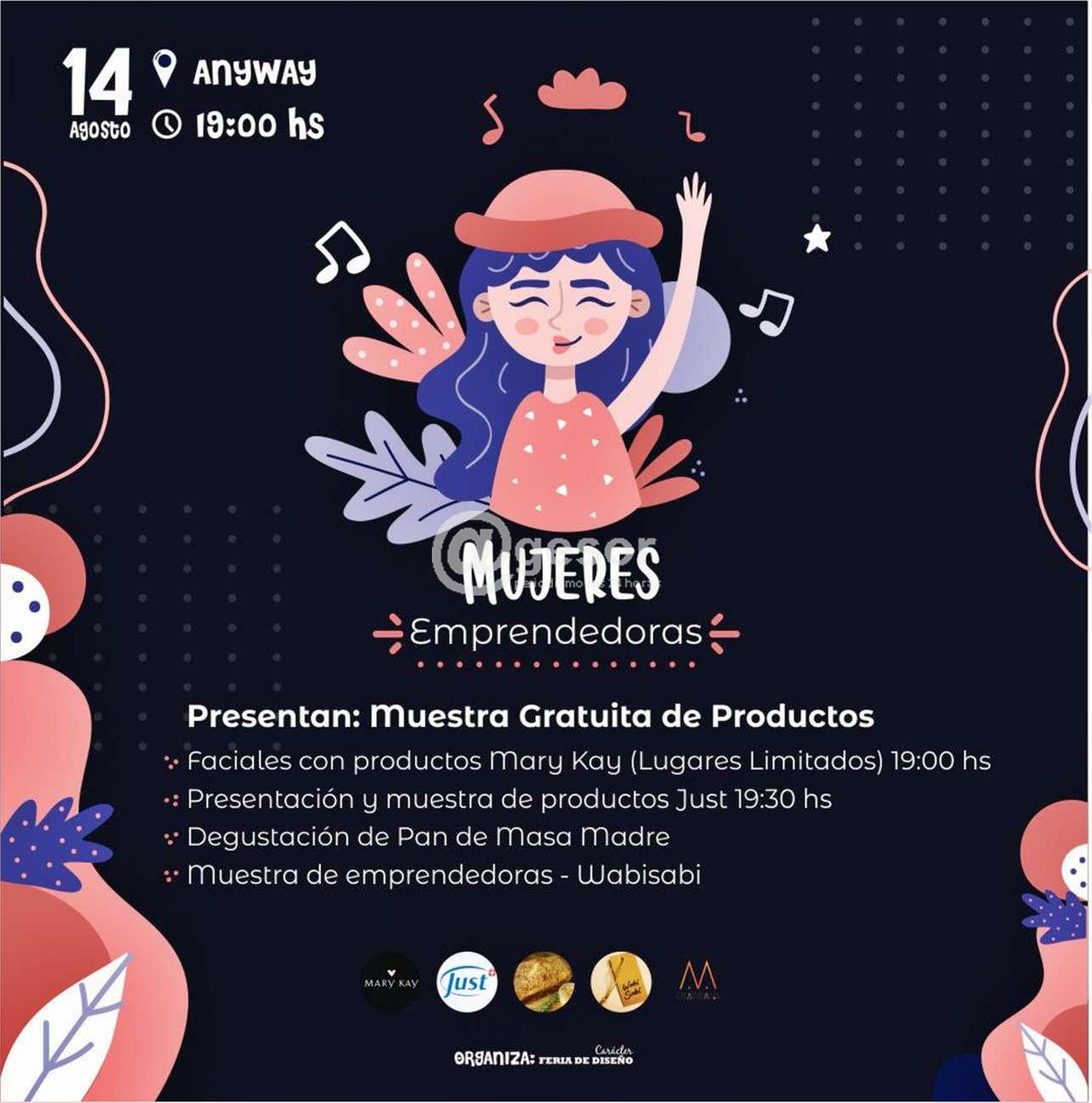 Este viernes 14 a las 19.00 horas en Anyway, MUJERES EMPRENDEDORAS estarán presentando "Muestra gratuita de productos" donde podrán apreciarse: