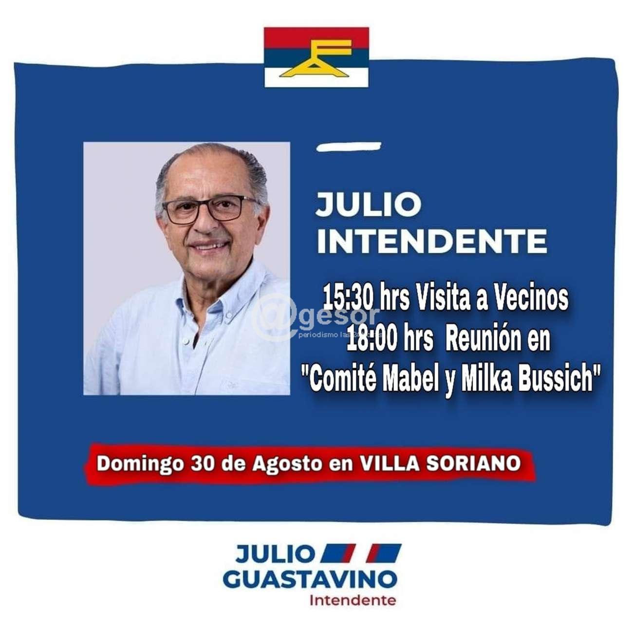 Este domingo 30 el candidato a Intendente de Soriano por el Frente Amplio, Dr. Julio Guastavino, estará concurriendo a Villa Soriano, desde las 15.30 horas dialogará con vecinos recibiendo inquietudes y presentando sus propuestas y a las 18.00 horas estara participando de reunión en el Comité de Base local que homenajea a "Mabel y Milka Bussich". Se invita a concurrir a los lugarreños que deseen escuchar y también consultar al candidato, haciéndolo con las medidas de prevención sanitaria correspondientes, entre ellas tapabocas obligatorio.
