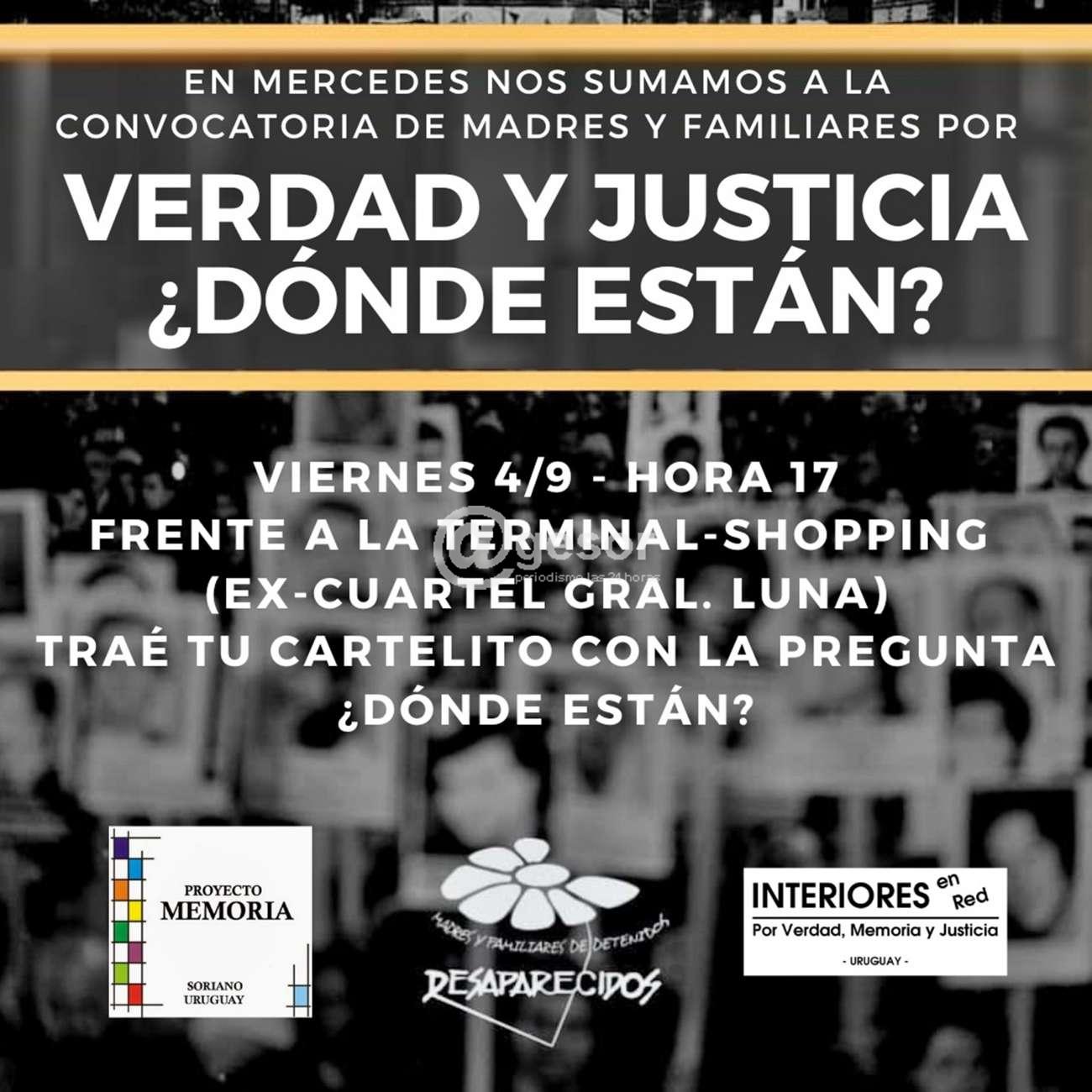 La Comisión Memoria, Justicia y contra la Impunidad de Soriano, realiza convocatoria en forma paralela a la que efectúa la organización Madres y Familiares de Detenidos Desaparecidos en Montevideo, y que también apoya Interiores en Red por Verdad, Memoria y Justicia. En el caso de Mercedes, la convocatoria es para las 17.00 horas frente al local que hoy ocupa Mercedes Terminal Shopping, ex Cuartel "Gral. Luna" y solicitan concurrir con cartelito con la pregunta "¿Dónde están?".