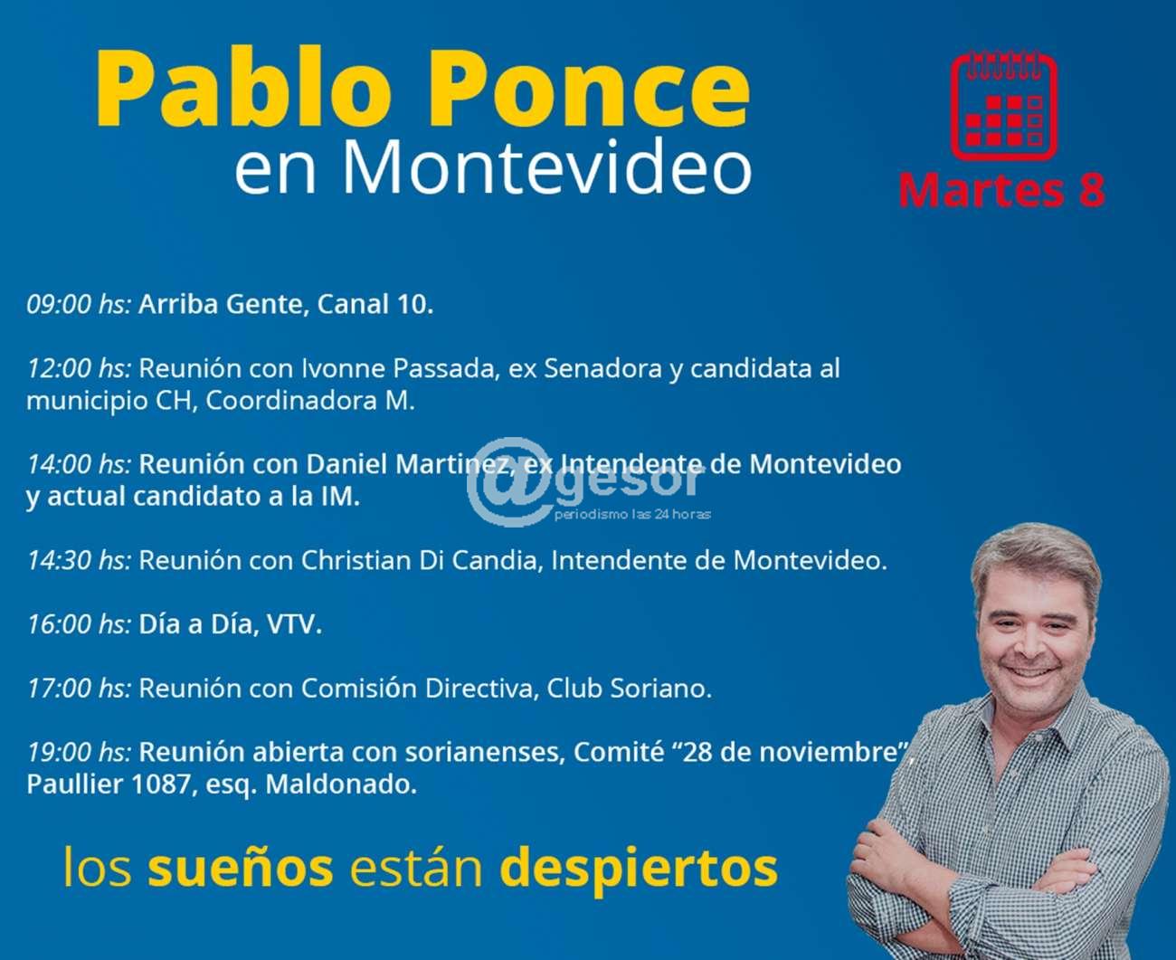 La jornada culminará por la noche, a las 19:00 hs en Comité “El 28” ubicado en Paullier 1087 esquina Maldonado, en el marco de encuentro que Ponce mantendrá con sorianenses que viven en Montevideo, y que este próximo 27 de setiembre votarán en nuestro departamento.