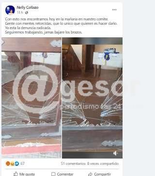 El edil Andriolo se refirió al tema en la media hora de la sesión de la Junta: “Nos queremos referir a un lamentable hecho que sucedió en la madrugada de hoy en Cardona, más precisamente en la sede de nuestra candidata a la Alcaldía de aquella ciudad la señora Nelly Collazo, la misma está ubicada en calle Lavalleja entre Barboza y Rivera. La sede fue victima del vandalismo ya que rompieron uno de los vidrios de la puerta de entrada. Repudiamos totalmente este tipo de actos y entre todos tenemos que seguir cuidando nuestro sistema democrático. Expresamos junto a nuestro compañero edil Marco Morosini respaldamos totalmente a la señora Nelly Collazo en este trance amargo que le tocó vivir”.
