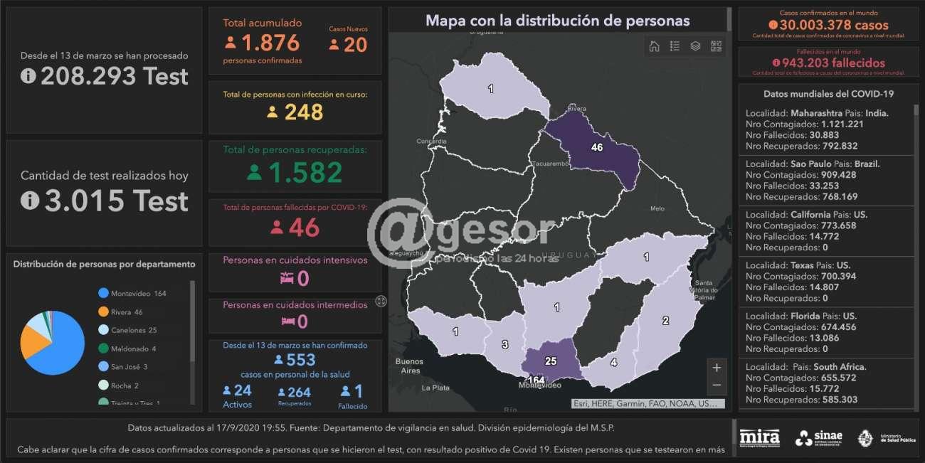 Los departamentos con casos al día de hoy son 10: Artigas, Canelones, Colonia, Florida, Maldonado, Montevideo, Rivera, Rocha, San José y Treinta y Tres.