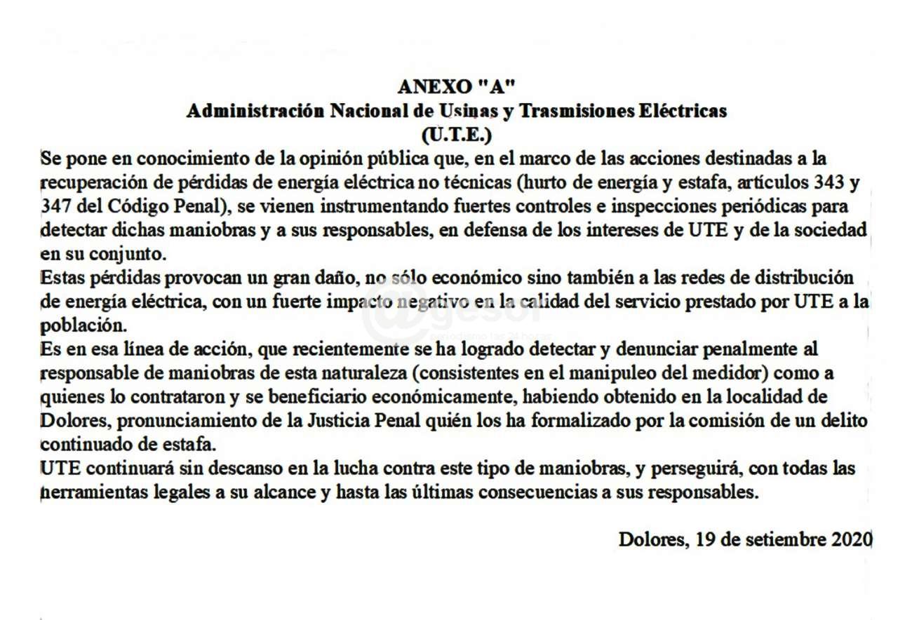 Se pone en conocimiento de la opinión pública que, en el marco de las acciones destinadas a la recuperación de pérdidas de energía eléctrica no técnicas (hurto de energía y estafa, artículos 343 y 347 del Código Penal), se vienen instrumentando fuertes controles e inspecciones periódicas para detectar dichas maniobras y a sus responsables, en defensa de los intereses de UTE y de la sociedad en su conjunto.