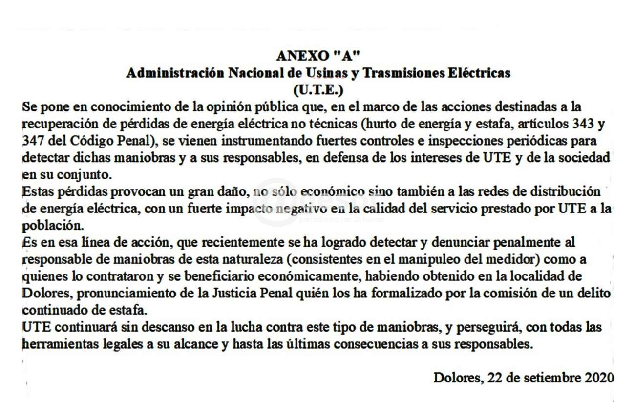 Se pone en conocimiento de la opinión pública que, en el marco de las acciones destinadas a la recuperación de pérdidas de energía eléctrica no técnicas (hurto de energía y estafa, artículos 343 y 347 del Código Penal), se vienen instrumentando fuertes controles e inspecciones periódicas para detectar dichas maniobras y a sus responsables, en defensa de los intereses de UTE y de la sociedad en su conjunto.