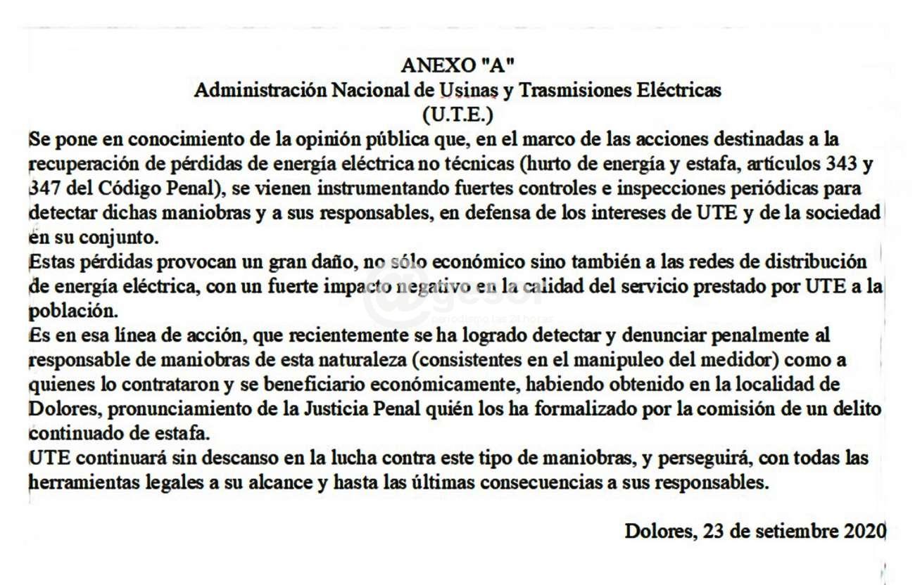 Se pone en conocimiento de la opinión pública que, en el marco de las acciones destinadas a la recuperación de pérdidas de energía eléctrica no técnicas (hurto de energía y estafa, artículos 343 y 347 del Código Penal), se vienen instrumentando fuertes controles e inspecciones periódicas para detectar dichas maniobras y a sus responsables, en defensa de los intereses de UTE y de la sociedad en su conjunto.