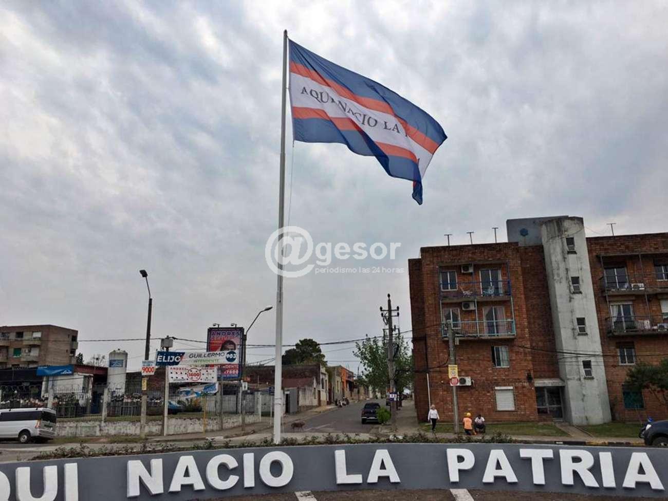 Ese mástil muestra flameando una gran bandera de Soriano y la rotonda incluye la frase que distingue al departamento, "Aquí Nació la Patria", que también lleva la bandera.