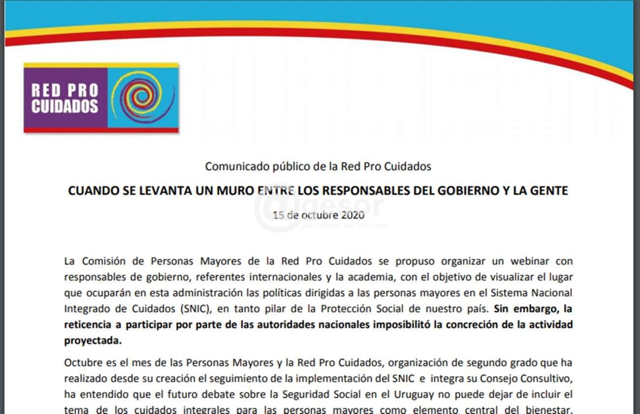 La Comisión de Personas Mayores de la Red Pro Cuidados se propuso organizar un webinar con responsables de gobierno, referentes internacionales y la academia, con el objetivo de visualizar el lugar que ocuparán en esta administración las políticas dirigidas a las personas mayores en el Sistema Nacional Integrado de Cuidados (SNIC), en tanto pilar de la Protección Social de nuestro país. Sin embargo, la reticencia a participar por parte de las autoridades nacionales imposibilitó la concreción de la actividad proyectada.
