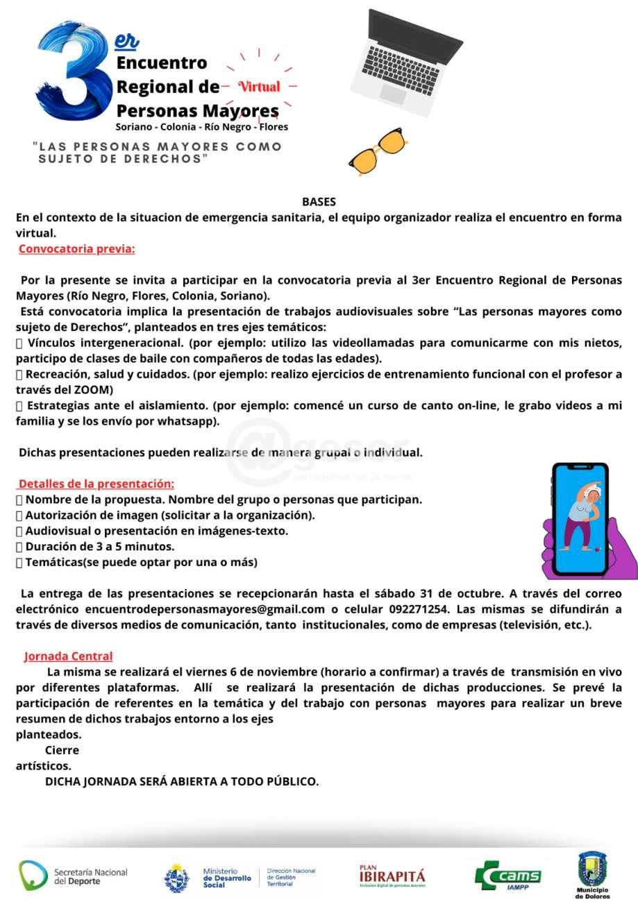 Plaza de Deportes Dolores (Secretaría Nacional del Deporte), Oficina Territorial MIDES Dolores, Plan Ibirapitá, CAMS- IAMPP y Municipio de Dolores se encuentran organizando el Tercer Encuentro Regional de Personas Mayores denominado "Las Personas mayores como sujetos de derechos".