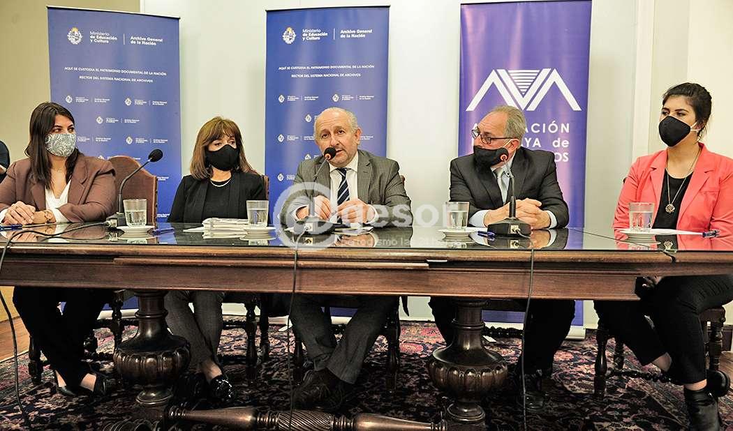Se firmó el convenio marco interinstitucional con la presencia del ministro y la subsecretaria de Educación y Cultura, Pablo da Silveira y Ana Ribeiro; el director del AGN, Alberto Umpiérrez; la presidenta y la secretaria de la AUA, Stella Infante y Victoria Fernández, y el subdirector de la Oficina de Planeamiento y Presupuesto (OPP), José Luis Falero.