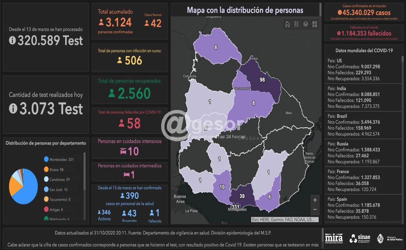 Desde que se declaró la emergencia sanitaria el 13 de marzo se han procesado 320.589 tests y se han registrado 3124 casos positivos de Coronavirus en todo el territorio nacional. De ese total 2560 ya se recuperaron y 58 fallecieron.