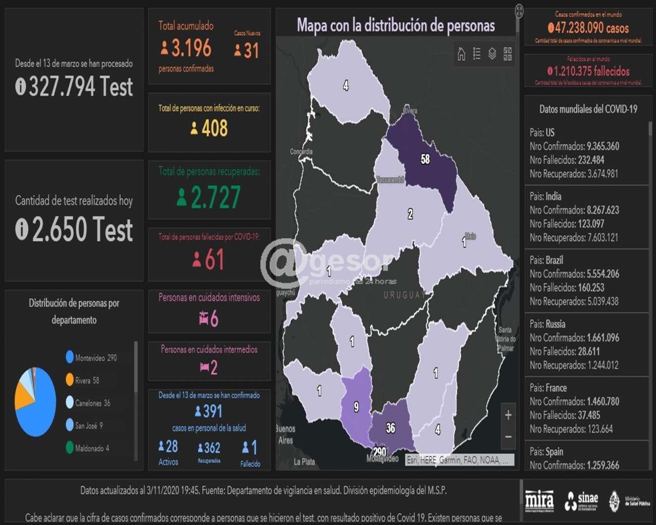 de Coronavirus COVID-19. De los 31 casos nuevos, 24 son de Montevideo, 4 de