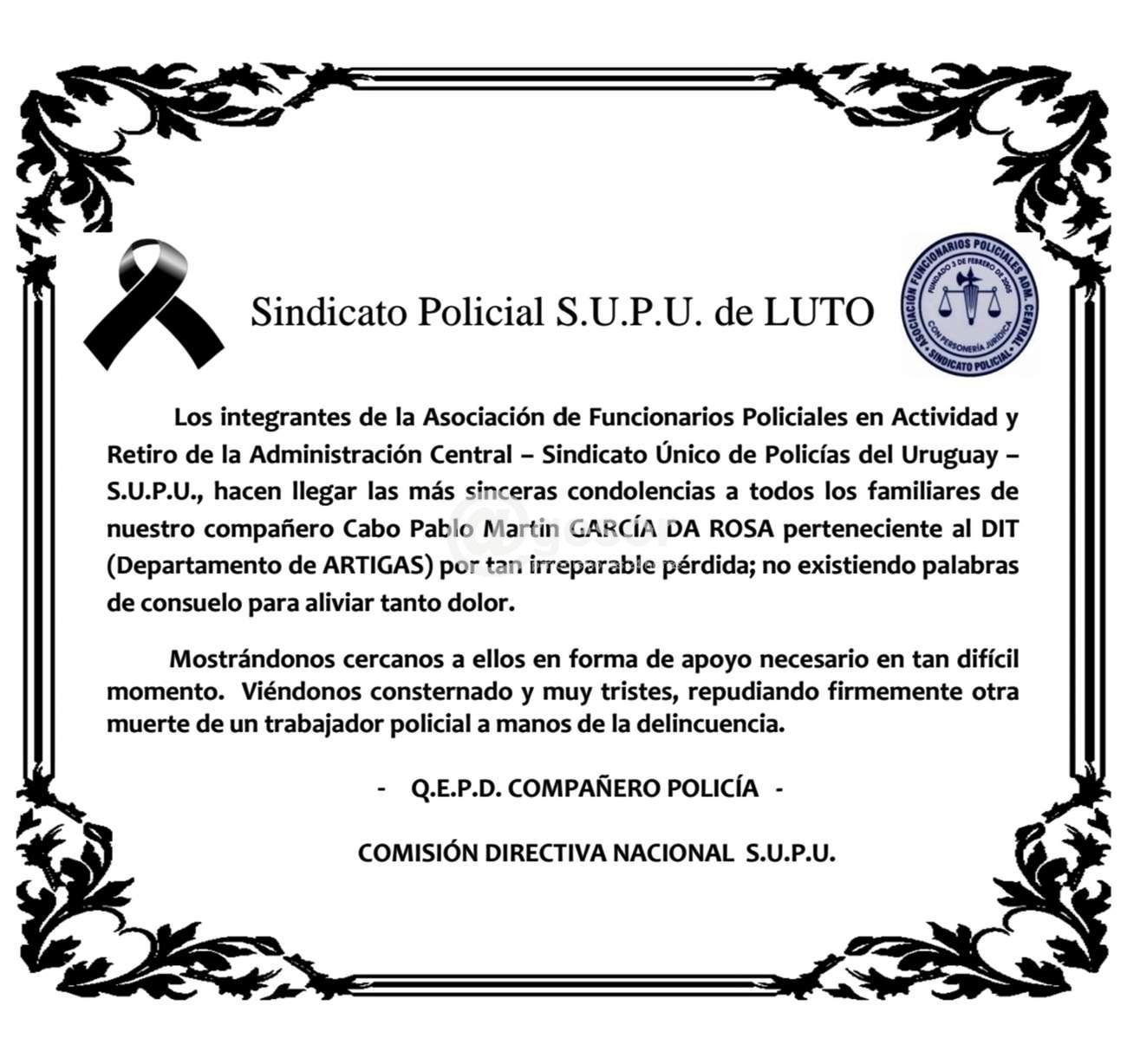 "Los integrantes de la Asociación de Funcionarios Policiales en Actividad y Retiro de la Administración Central - Sindicato Unico de Policías del Uruguay - SUPU, hacen llegar las más sinceras condolencias a todos los familiares de nuestro compañero Cabo Pablo Martín García da Rosa perteneciente al DIT (Departamento de Artigas) por tan irreparable pérdida; no existiendo palabras de consuelo para aliviar tanto dolor.