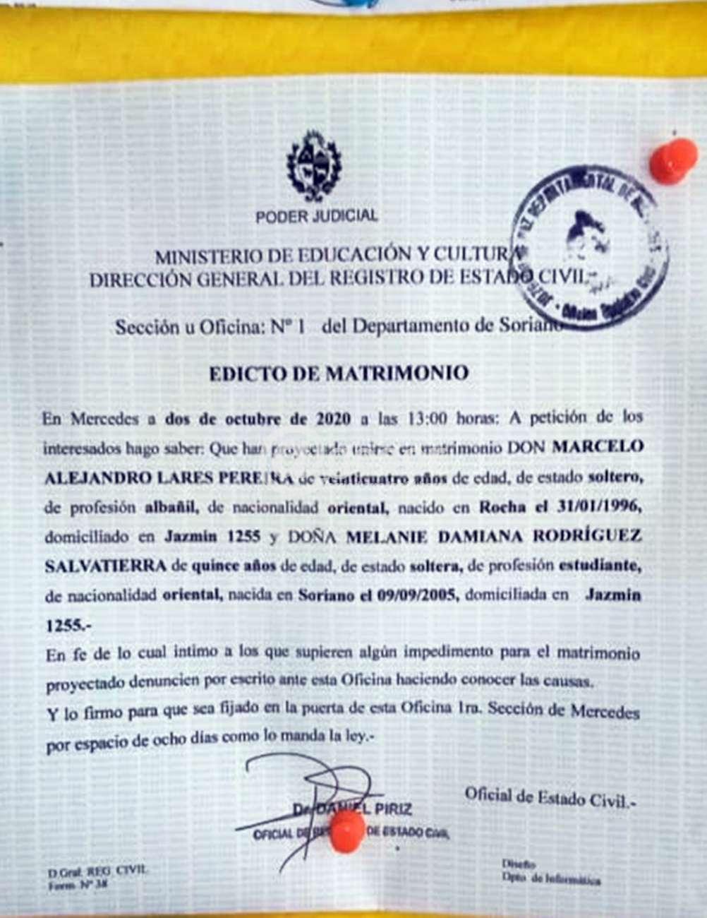 Un hecho inusual, que sin dudas afectó las expectativas de dos jóvenes que más allá de las circunstancias que cada uno pueda juzgar, decidieron unir su vida en matrimonio, se dio en Mercedes, a partir de un grueso error cometido por funcionarias y refrendado por el propio Juez de Paz Departamental de Primer Turno de Mercedes, Dr. Daniel Píriz Cotignola, quien con fecha 2 de octubre 2020 labró el edicto de matrimonio por el cual a las 13.00 horas se presentaron Marcelo Alejandro Lares Pereira de 24 años y Melanie Damiana Rodríguez Salvatierra de 15 años (nacida el 9/9/2005) estableciendo como domicilio Jazmín 1255. "En fe de lo cual intimo a los que supieren algún impedimento para el matrimonio proyectado denuncien por escrito ante esta Oficina haciendo conocer las causas. Y lo firmo para que sea fijado en la puerta de esta Oficina 1ra. Sección de Mercedes por espacio de ocho días como lo manda la ley", firma Dr. Daniel Píriz.