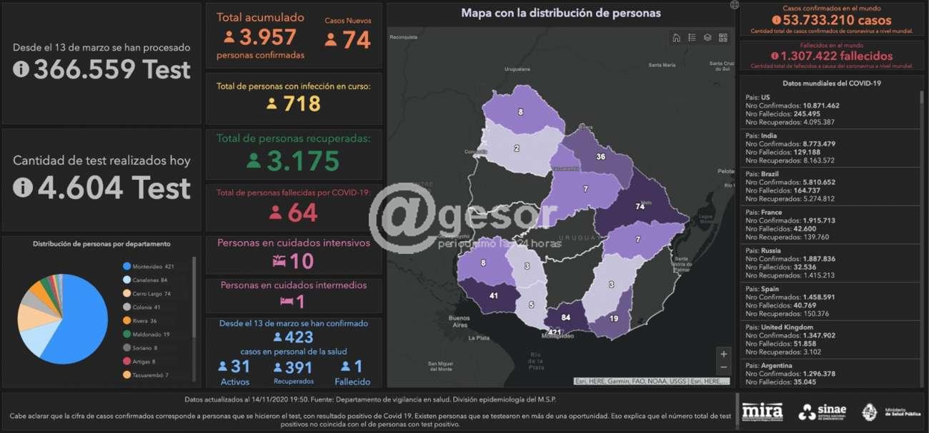 De acuerdo a la información proporcionada por el Ministerio de Salud Pública (MSP), hoy se llevaron a cabo 4604 análisis y se detectaron 74 nuevos casos de Coronavirus COVID-19. De los 74 casos nuevos, 40 son de Montevideo, 9 de Canelones, 7 de Cerro Largo, 5 de Colonia, 3 de Soriano, 3 de Tacuarembó, 2 de Maldonado, 2 de Rivera, 2 de San José y 1 de Artigas. En todos los casos están identificados y cuarentenados los contactos y se mantiene un estricto seguimiento epidemiológico.